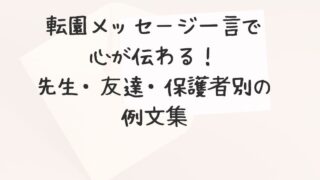 未分類 転園メッセージ一言で心が伝わる!先生・友達・保護者別の例文集 お子さんの転園が決まったとき、先生や友達、保護者の方に「どんな一言を伝えればいいの?」と悩む方は多いですよね。長文でなくても、短くても心がこもった言葉ならしっかり思いは届きます。この記事では「転園メッセージ 一言」をテーマに、先生・友達・保... 未分類