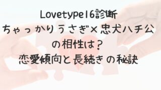 生活 Lovetype16診断|ちゃっかりうさぎ×忠犬ハチ公の相性は?恋愛傾向と長続きの秘訣 恋愛相性って、相手との関係をもっと深めたいときこそ気になりますよね。今回は話題の「Lovetype16診断」の中でも人気ペアのひとつ、「ちゃっかりうさぎ(FCRE)」と「忠犬ハチ公(FCPE)」の相性について徹底解説します。甘え上手なうさぎ... 生活